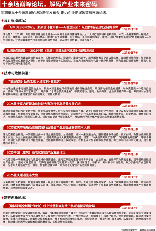 展會(huì)期間,組委會(huì)將聯(lián)合行業(yè)協(xié)會(huì)、權(quán)威媒體及頭部企業(yè),舉辦10余場專題論壇,緊扣產(chǎn)業(yè)趨勢、產(chǎn)品走向、舊改局改、以舊換新、適老家居、出海貿(mào)易、設(shè)計(jì)師活動(dòng)、整裝快裝、新媒體營銷等核心議題,匯聚50+位行業(yè)領(lǐng)袖、學(xué)術(shù)專家與先鋒設(shè)計(jì)師,通過主題演講、圓桌對話、案例剖析等形式,深度解析政策紅利、技術(shù)趨勢與市場機(jī)遇,為行業(yè)提供從戰(zhàn)略到落地的全景式洞察。
