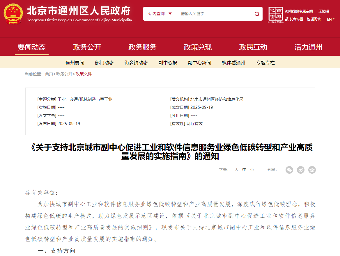 《關于支持北京城市副中心促進工業(yè)和軟件信息服務業(yè)綠色低碳轉型和產業(yè)高質量發(fā)展的實施指南》的通知